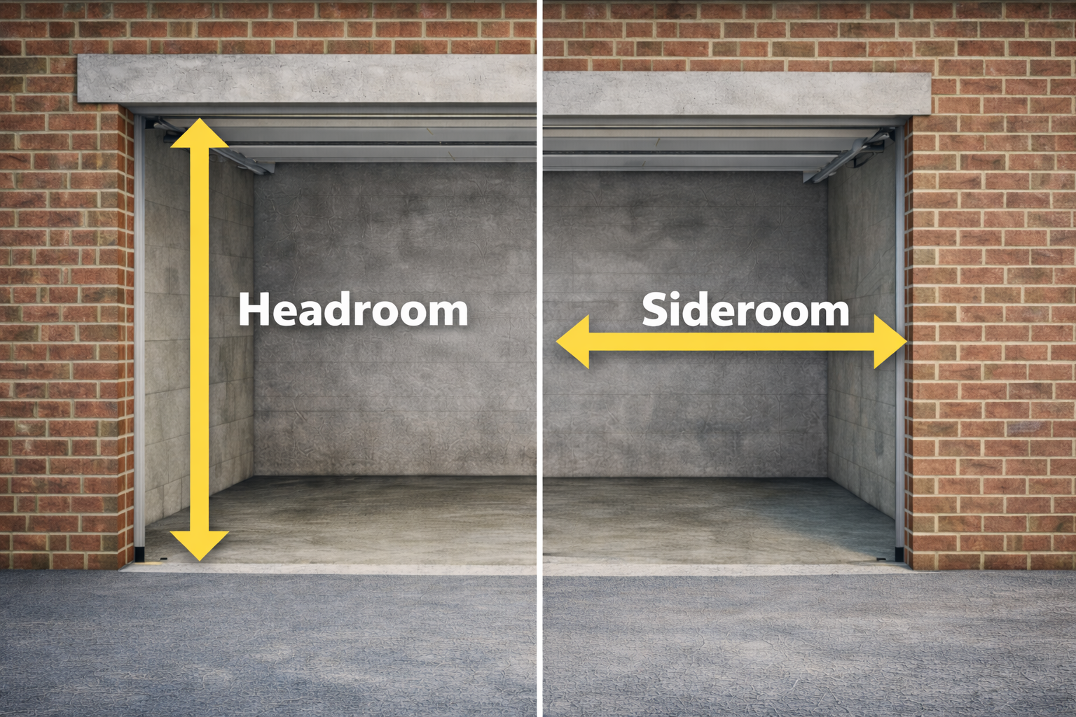 Sideroom refers to the horizontal space either side of the garage opening, measured inside the garage from the edge of the opening to the nearest wall or obstruction. This space is typically used for:
